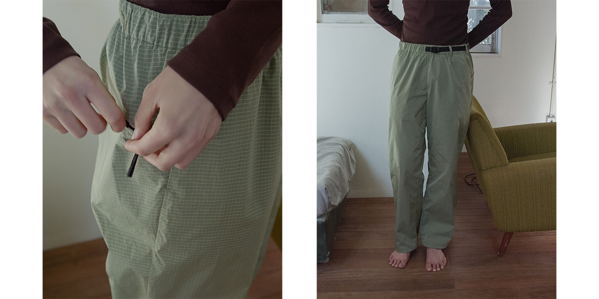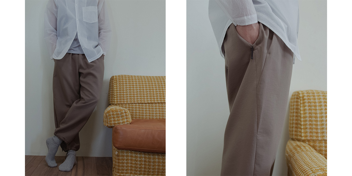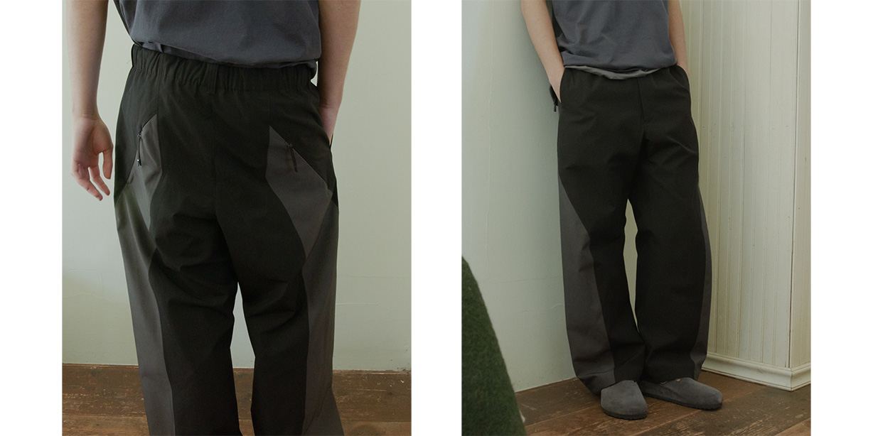 Eine wasserabweisende Ausrüstung schützt vor leichtem Regen. An Teilen der Hose wird Ultraschallverschweißung eingesetzt, um Nähte zu minimieren und ein klares, minimalistisches Erscheinungsbild zu erzielen, das zudem hautfreundlich ist. Die relaxed-straight-Silhouette und ein bequemer Bund mit elastischem Einsatz + Kordelzug setzen Komfort für unterwegs in den Mittelpunkt — ideal für urban auftretende Pendler, die eine technisch-polierte Hose suchen.