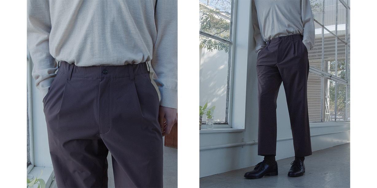 Ein S/S-Basisteil, bekannt für seine elegante Silhouette und seinen Komfort: Die One Tuck Tapered Light Pants verwenden Solotex für ein weiches Griffgefühl, starke Rückstellfähigkeit und leichten Stretch. Der Stoff ist wasserabweisend gegen leichte Schauer. Die einlagige Falte (one tuck) im Bund bietet bequem Raum im Hüftbereich und läuft sanft zu einem knöchellangen (9/10) Saum hin schmal zusammen. Ein Bund mit Elastik + Kordelzug und Gürtelschlaufen macht die Hose für Business-Casual-Tragen geeignet, während praktische Details wie eine Sicherheitsfach-Tasche und Netz-Innentaschen den Alltag erleichtern.