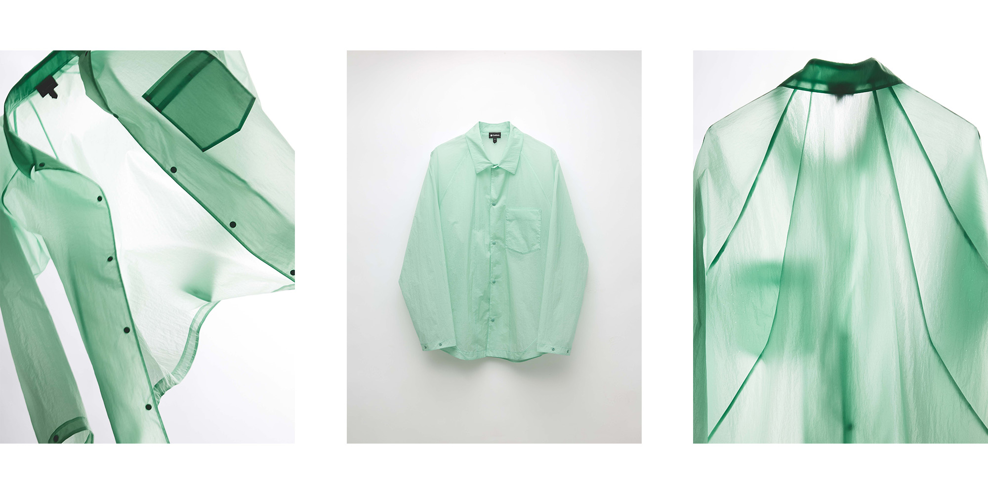 “This is made from sheer nylon with beautiful color expression. We also developed a stand-collar jacket in the same fabric, so we considered the balance carefully so the pieces would look great together as well. The split raglan sleeves are another advantage—they don’t feel bulky when layered, and they make movement easier. We spent a lot of time thinking about how to give such a technical material an elegant finish. At first, we even tested ultrasonic bonding, but in the end we chose a bound-seam construction because it looked the most beautiful when seen through the fabric.”