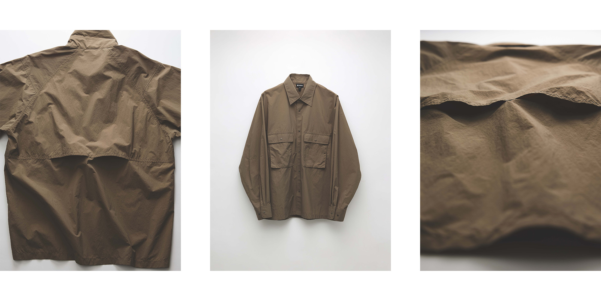 “Goldwin has developed lightweight nylon outerwear in the past—pieces you can throw on as casually as a coach jacket—and this shirt grew out of that same idea. The front uses snap buttons, and the back yoke actually conceals a bold internal ventilation structure that effectively releases heat and humidity even when you sweat. It’s a shirt, but it can also be worn like an outer layer.”
