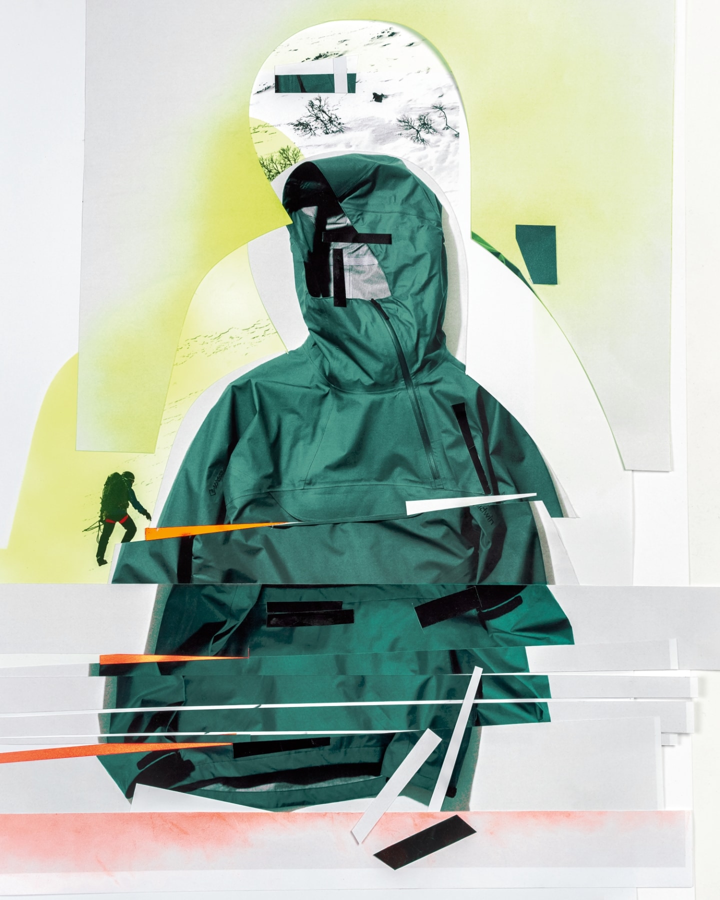 頑丈さと薄さを兼ね備えた30デニールのゴアテックス プロダクト、腕や肩周りを動きやすくする立体設計を採用することで、本格的な冬山登山にもフィットする軽量性や運動性を備えたシェルジャケット。ずり上がりを防止する裾のレッグループや防寒性の高いハイネックガードなどはプルオーバー型と同じディテール。フロント中央のフラップは内側が面ファスナー仕様のため開閉がしやすく、その両側に配備したフラップはともに内側にファスナーが2本付いており、1つは胸ポケット、もう1つはミドラーへのアクセスをスムーズにしつつ、面ファスナーでフラップを広げて固定できるのでポケットベンチレーションから風を入れやすくする役割も果たす。シュプールラインを取り入れた曲線的なデザイン、「日本の四季」をイメージしたスモーキーな配色もプルオーバーと共通した特徴だ。