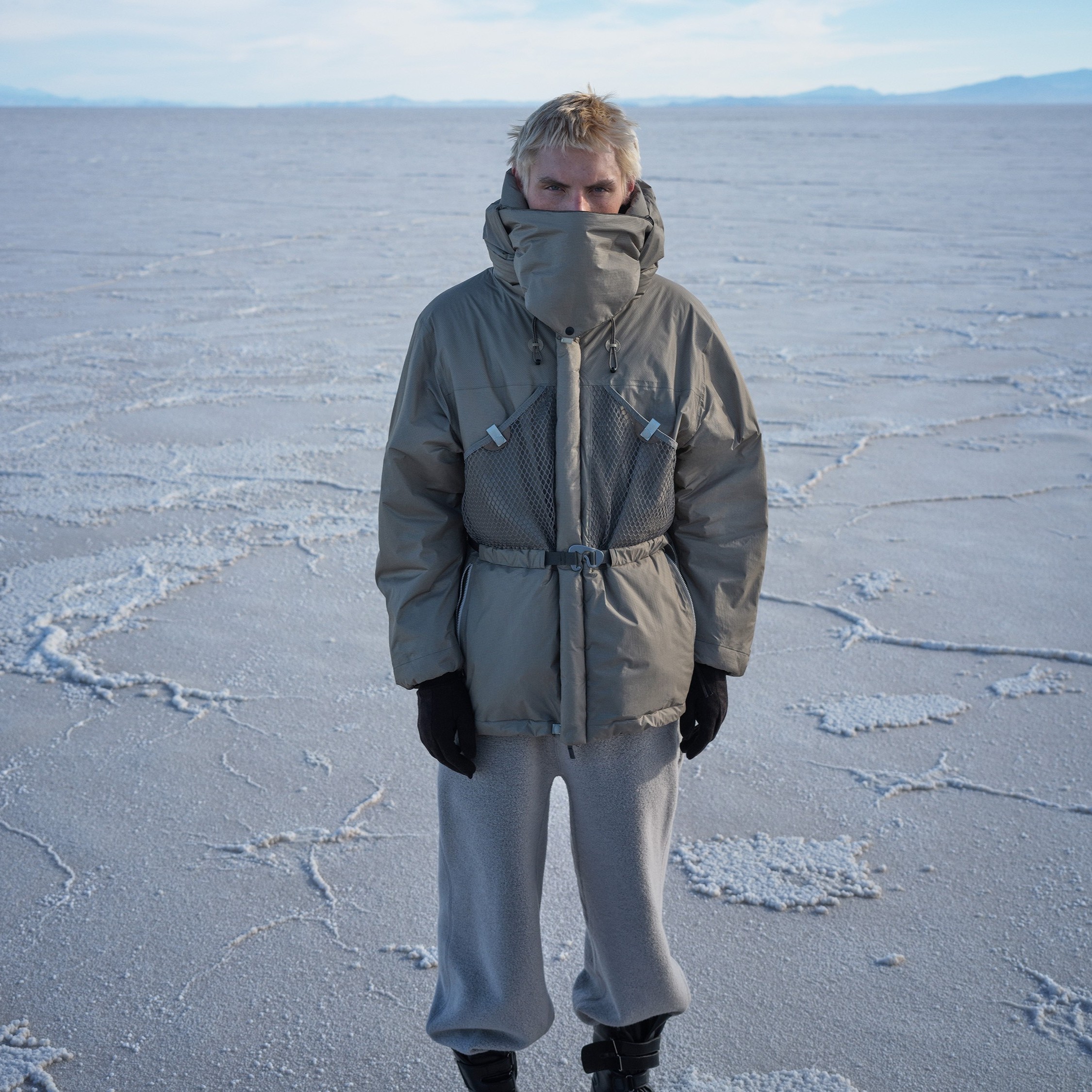 컬렉션의 전반은 원형 실루엣과 하이 퍼포먼스 아웃도어 장비의 세심하고 복잡한 요소에 초점이 맞춰져 있다. 프리마로프트(Primaloft) 충전재와 초경량 고어텍스 윈드스토퍼(GORE-TEX WINDSTOPPER)로 제작된 단열 파카와 숏 코쿤 재킷은 방풍 기능과 놀라운 경량성을 동시에 제공합니다. 메쉬 포켓과 단열 튜빙 같은 디테일은 파카 겉면에 드러내, 평소에 숨겨져 있는 섬세한 구조적 요소를 보여준다.