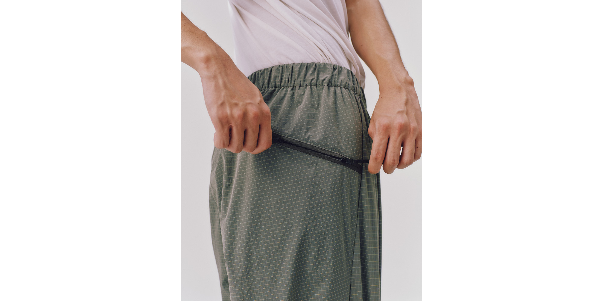 The Dope Dyed Rip-Stop Pants, crafted from Goldwin’s original ripstop fabric with subtle shading and rich color depth, offer a relaxed fit that still feels refined. A back zip pocket is cleverly placed along the panel seam, equipped with a double slider zipper for versatile opening options.