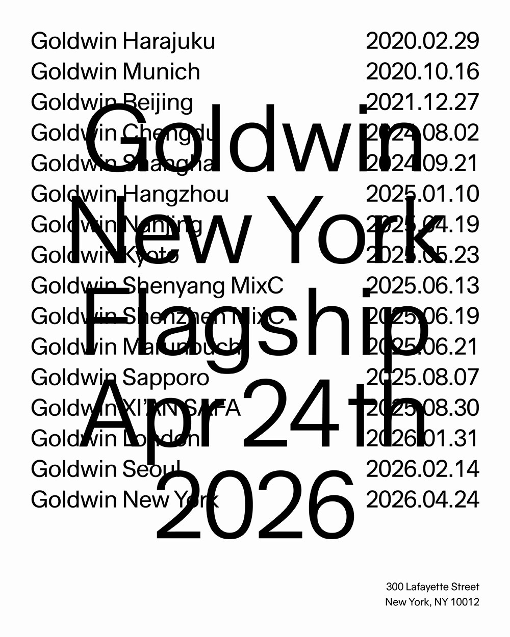 We are pleased to announce the opening of Goldwin New York on April 24, 2026, located at 300 Lafayette Street in the heart of SoHo. The new 1,815 sq ft space embodies the brand’s dedication to Japanese aesthetics, technical innovation, and the inherent beauty of materials.